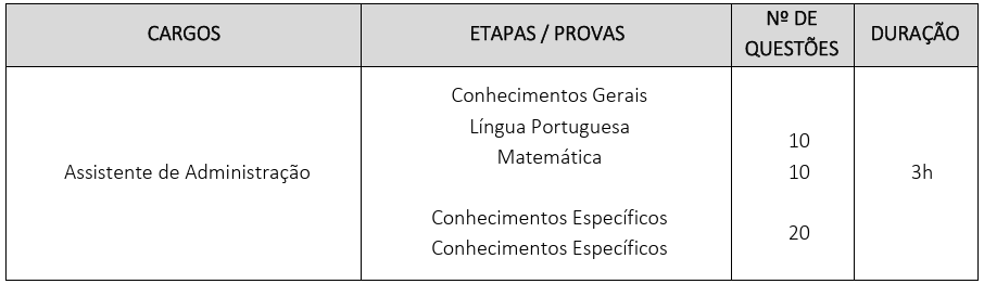 A prova será apenas objetiva (questões com alternativas de multipla escolha) e será composta por 40 questões, dividida em dois campos: conhecimentos gerais (português e matemática) e conhecimentos específicos (conhecimentos específicos do cargo). Cada questão valerá 2,5 ponto, totalizando o total de 100 pontos