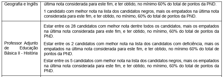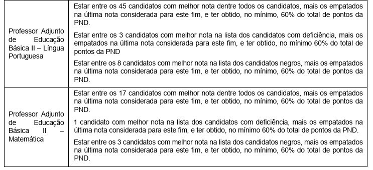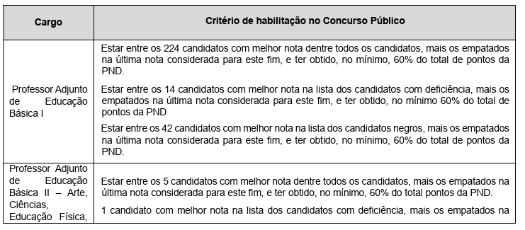Para ser considerado habilitado para as fases seguintes, o candidato deverá obter a pontuação da Prova Nacional Docente exigida conforme a Tabela abaixo: