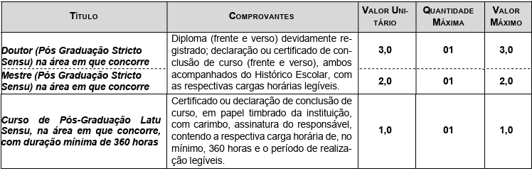 Haverá prova de Títulos de caráter classificatório para os candidatos habilitados na prova de performance, para todos os cargos. Os pontos dos títulos serão somados ao total de pontos obtidos na prova escrita e na prova de performance, observada a pontuação mínima de 50% em cada uma das provas.